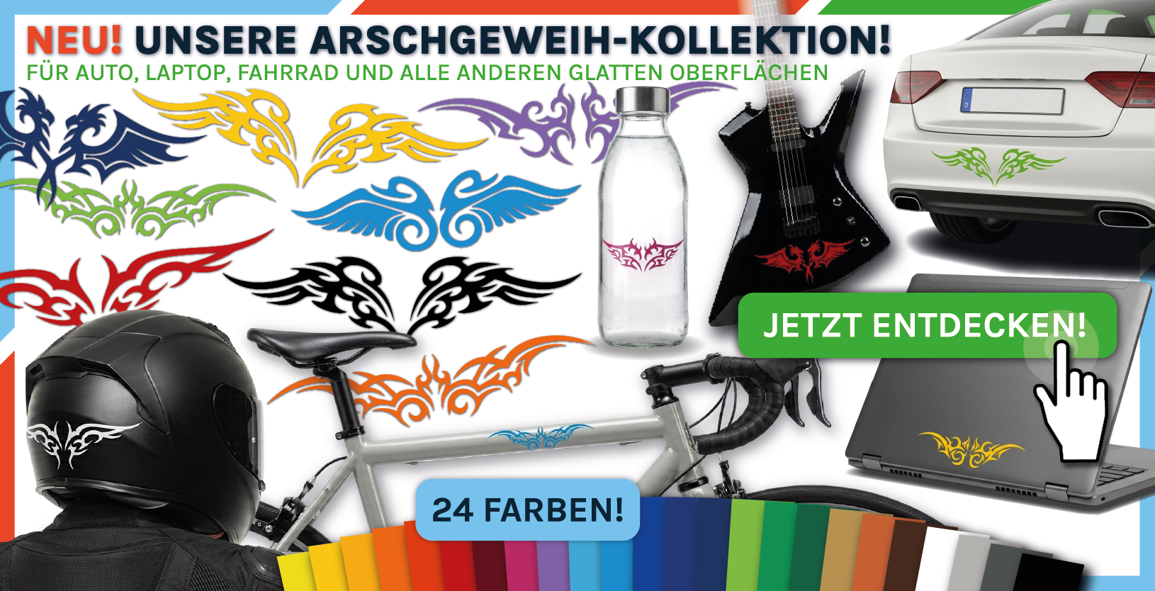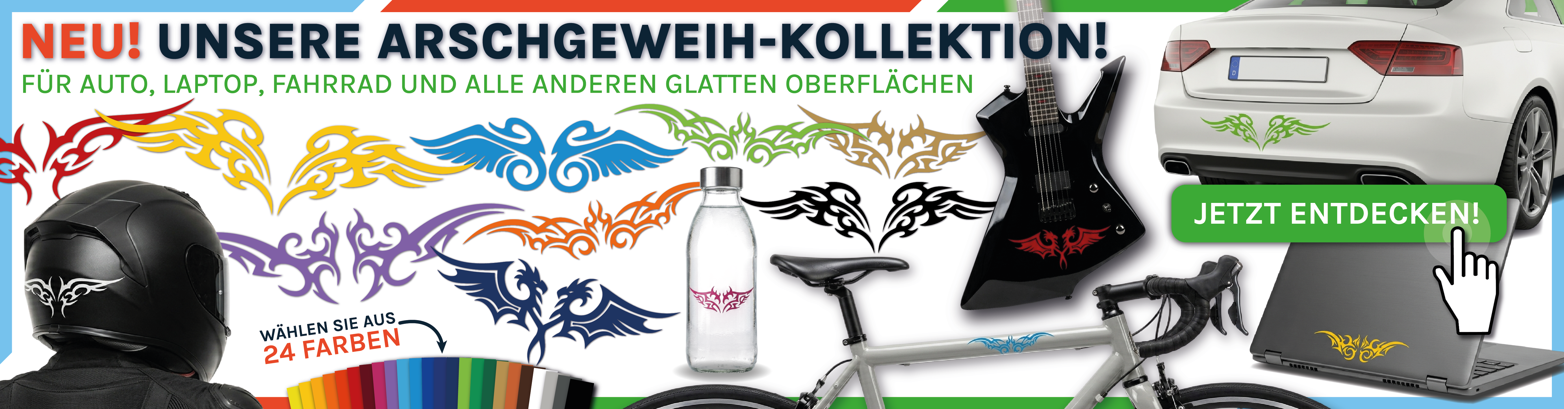 Ob klassische Motive wie Tiere und Tribals oder Ihre ganz persönliche Wunsch-Domain – bei uns gestalten Sie Ihr Fahrzeugdesign professionell und einfach selbst. Profitieren Sie von erstklassiger Materialqualität, Langlebigkeit und attraktiven Preisen für Ihr individuelles Tuning. Wir liefern Premium-Aufkleber, die perfekt zu Ihnen und Ihrem Auto passen.